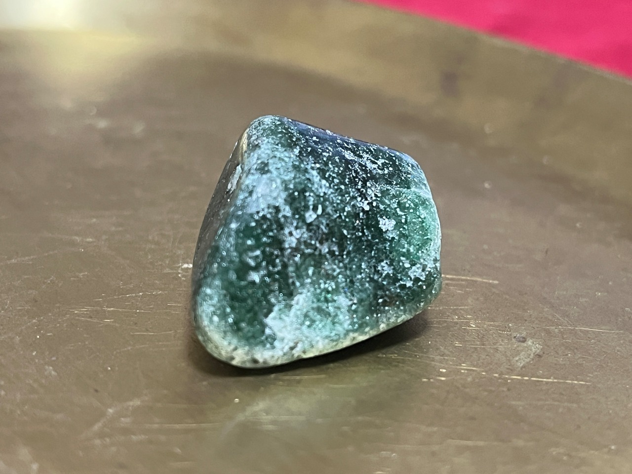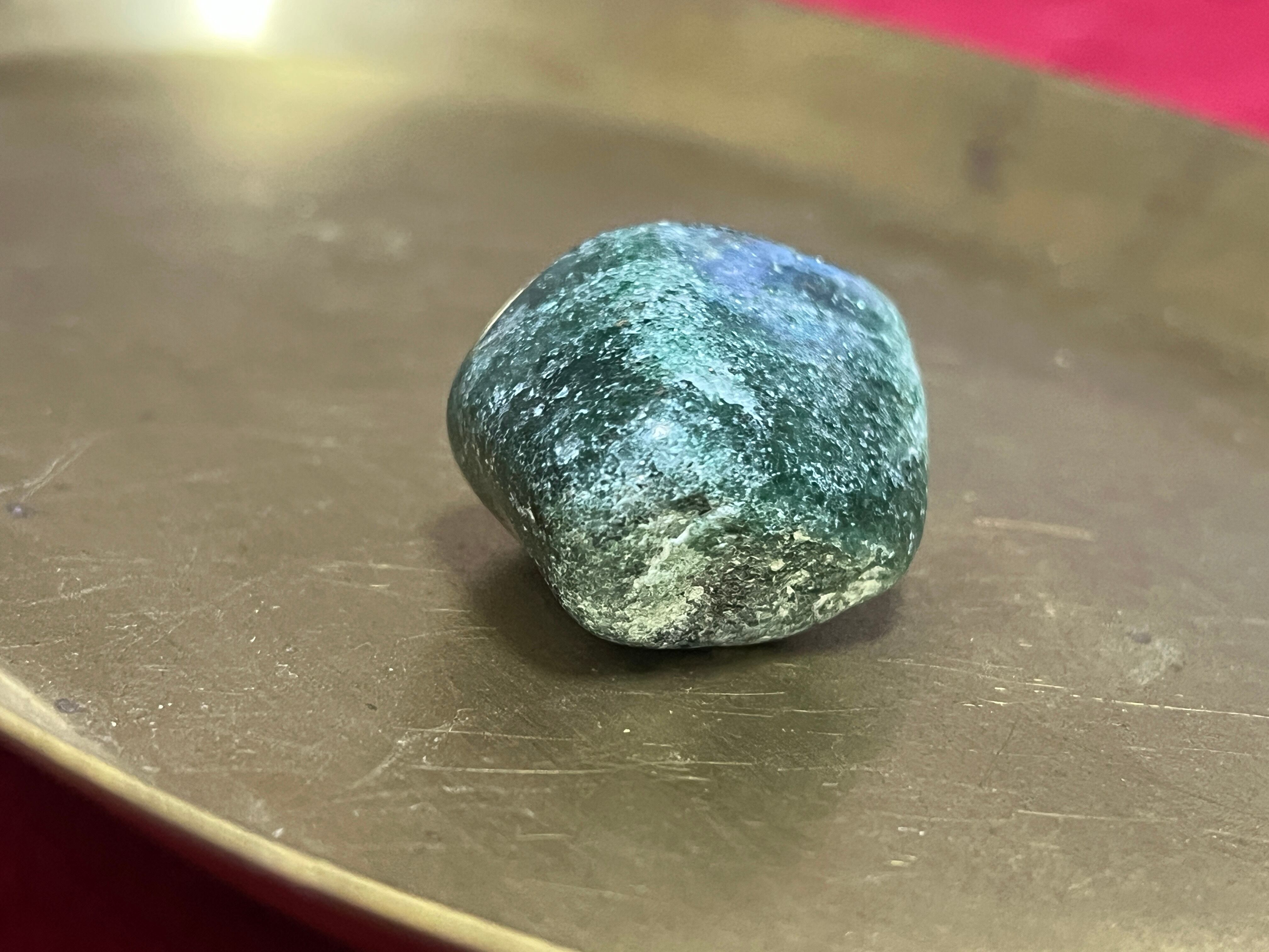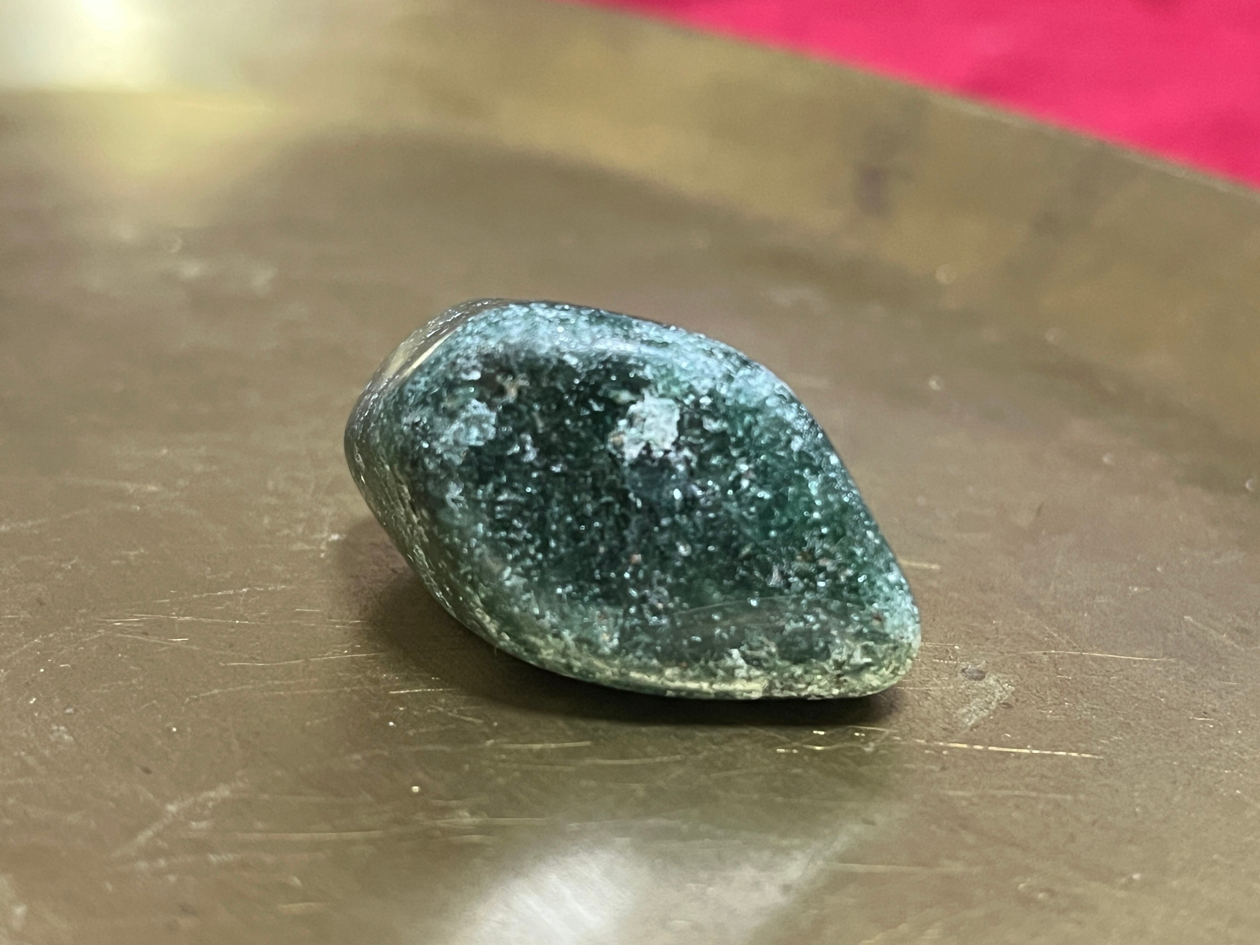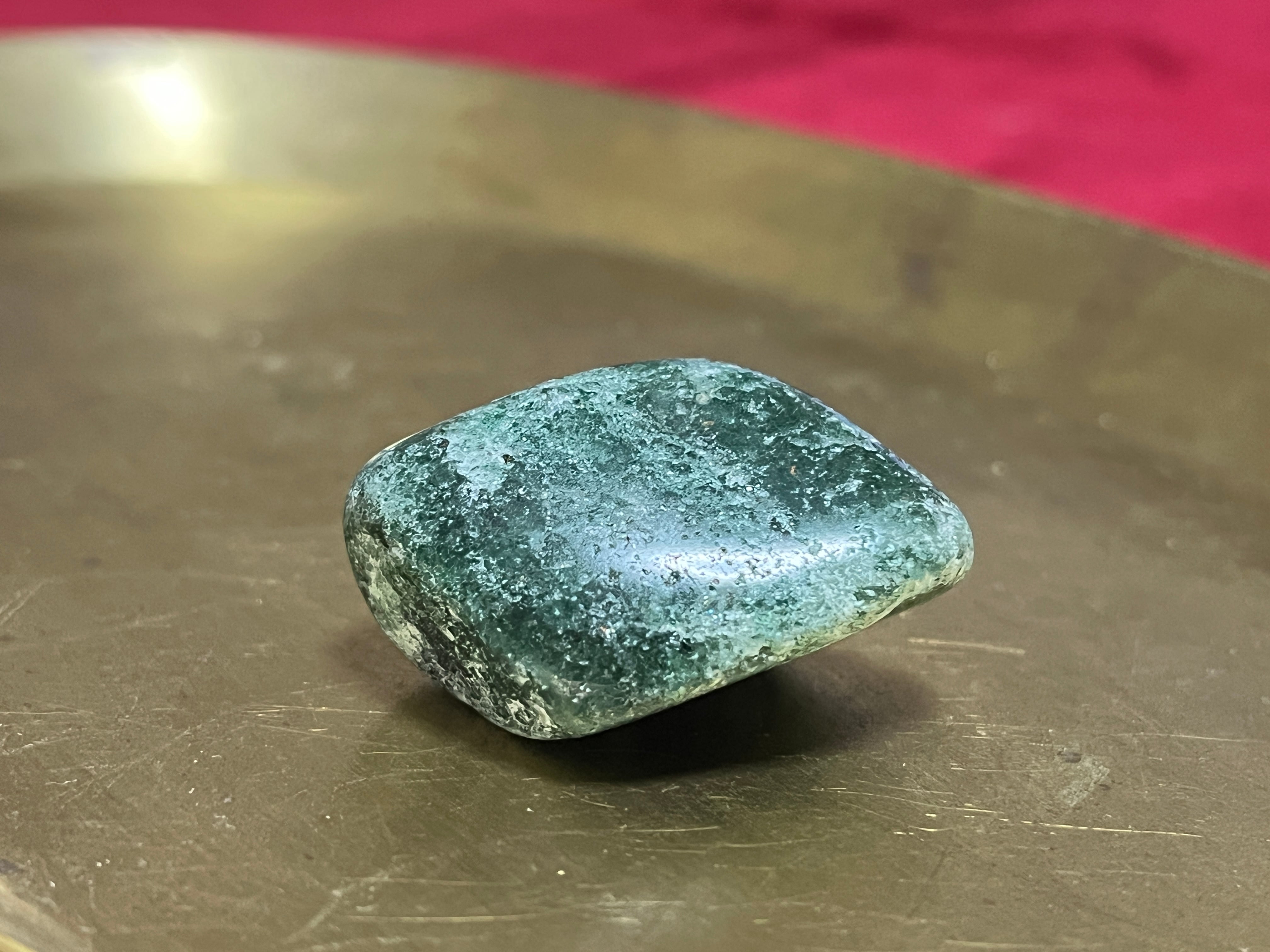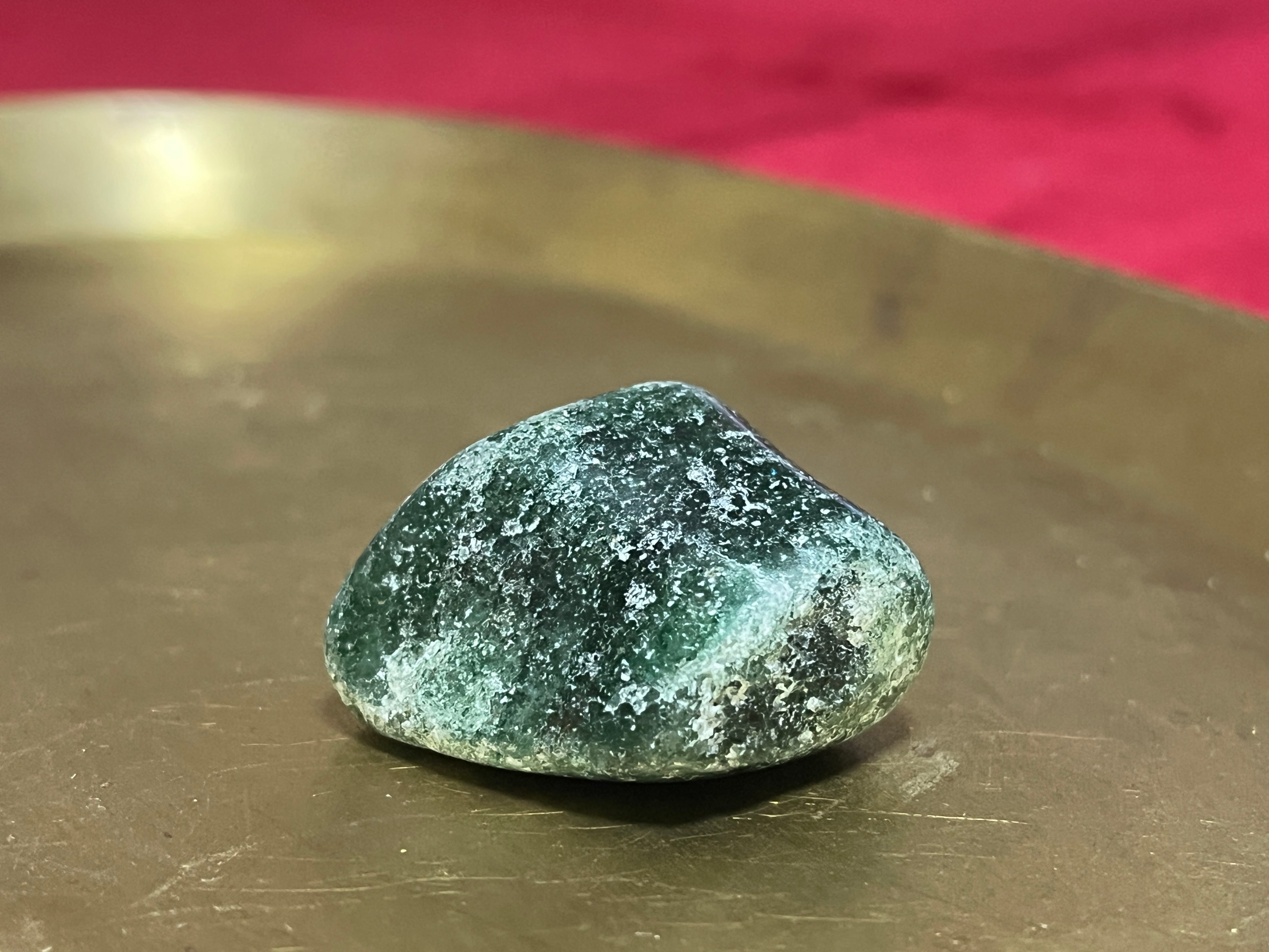 タンザニア産グリーンタンズベリークォーツ(フックサイトとクロミウムを内包したアベンチュリン)のタンブルです。キラキラが美しいです。