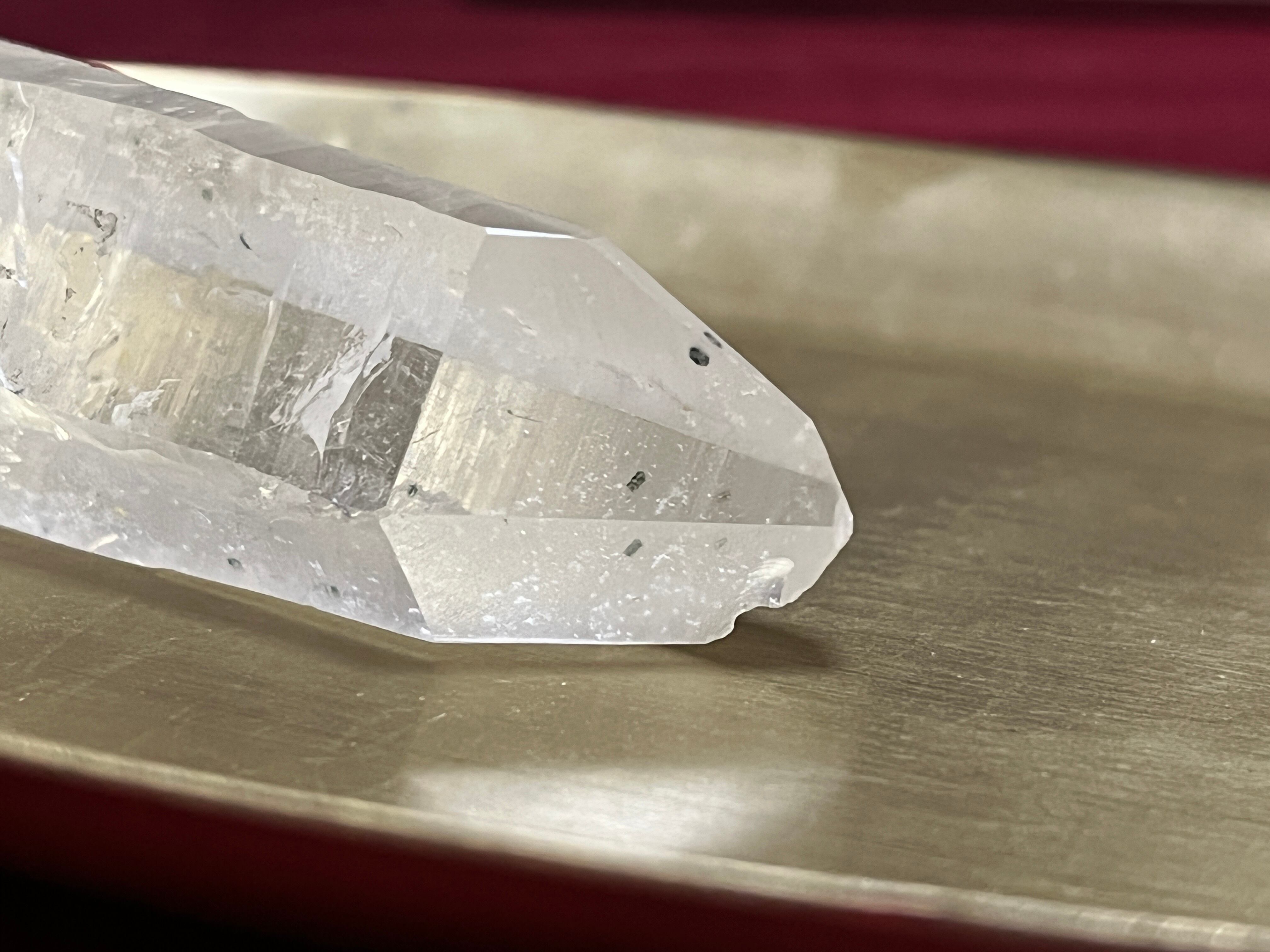 また、レーザークオーツは先端に行くほど細くなった形状の水晶のことを言い、レーザーのように鋭い形状をしていることから名付けられたと言われています。こちらはどちらかというと細身なタイプではありませんが透明度が高く、安定感があるレーザークオーツです。治癒力が高いとも言われており、急にご縁が繋がる時は、持ち主にとって何か癒しが必要な時とも言われています。